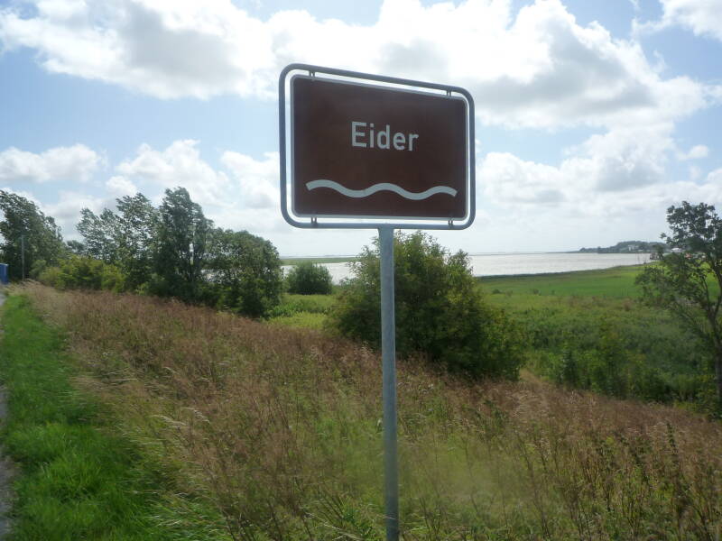 gevallen op Heide, het is net zover als Busum maar ligt meer in de lijn van waar ik heen moet om over de Elbe te komen. Een paar km na Husum ben ik over de Eider gekomen, die ging flink te keer. Dikke schuimkoppen en ontzettend wild water. Het wordt nog warm. De regenjas is ondertussen uit en de fleece-jas heb ik los gedaan. Trouwens even na Husum en even voor de brug over de Eider ging dus even mis. Ze zijn daar met de weg bezig en hebben een omleiding bedacht voor de fietsers dat die gemakkelijker over de brug kunnen. Maar zoals altijd gebeurd, je krijgt een hele tijd