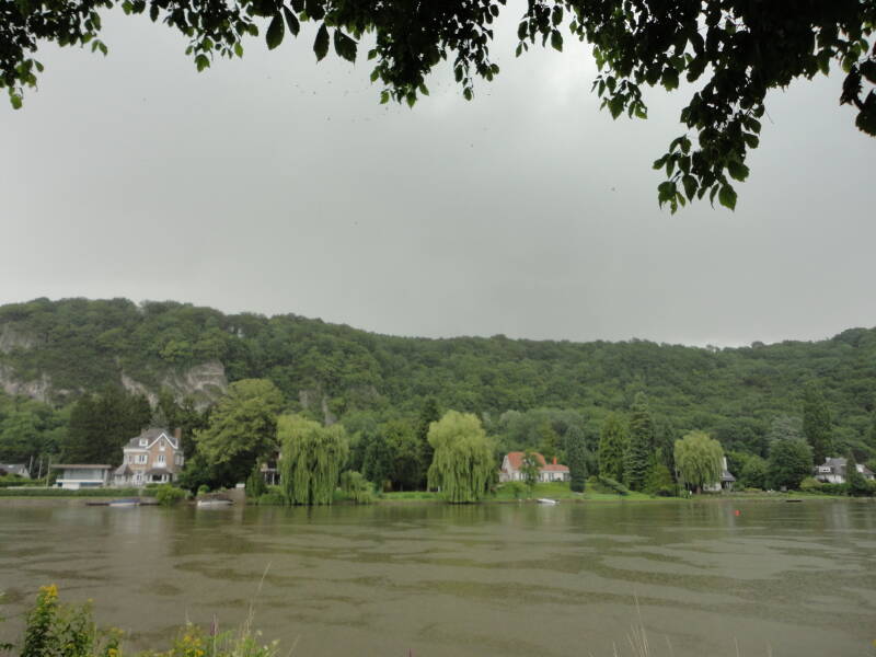 Eerst even kijken waar ik mijn fiets neerzet. Na even zoeken vind die een plaats bij een restaurant tegen een fietspaal, en kan ik het stadje gaan verkennen. Na een uurtje rondgelopen te hebben heb ik het wel gezien. Even iets eten en wat drinken en ik ga weer richting Namen. Tijdens het eten begint het plotseling te regen, niet hard maar het laat wel een paar flinke plassen op straat verschijnen. Na vijf minuten is het over. Ik heb mijn maaltijd op en reken af. Ik wil eigenlijk aan de andere kant van de Maas weer terug, maar na een paar kilometers kom ik tot de conclusie dat het niet goed gaat komen wanneer ik dat ga doen. Dus maar weer terug naar het centrum en de oude weg weer terug langs de Maas. Begin al aardig te wennen aan het slecht onderhouden fietspad. Er zijn ook best grote stukken dat wel goed is, maar ook dat is niet echt super goed.