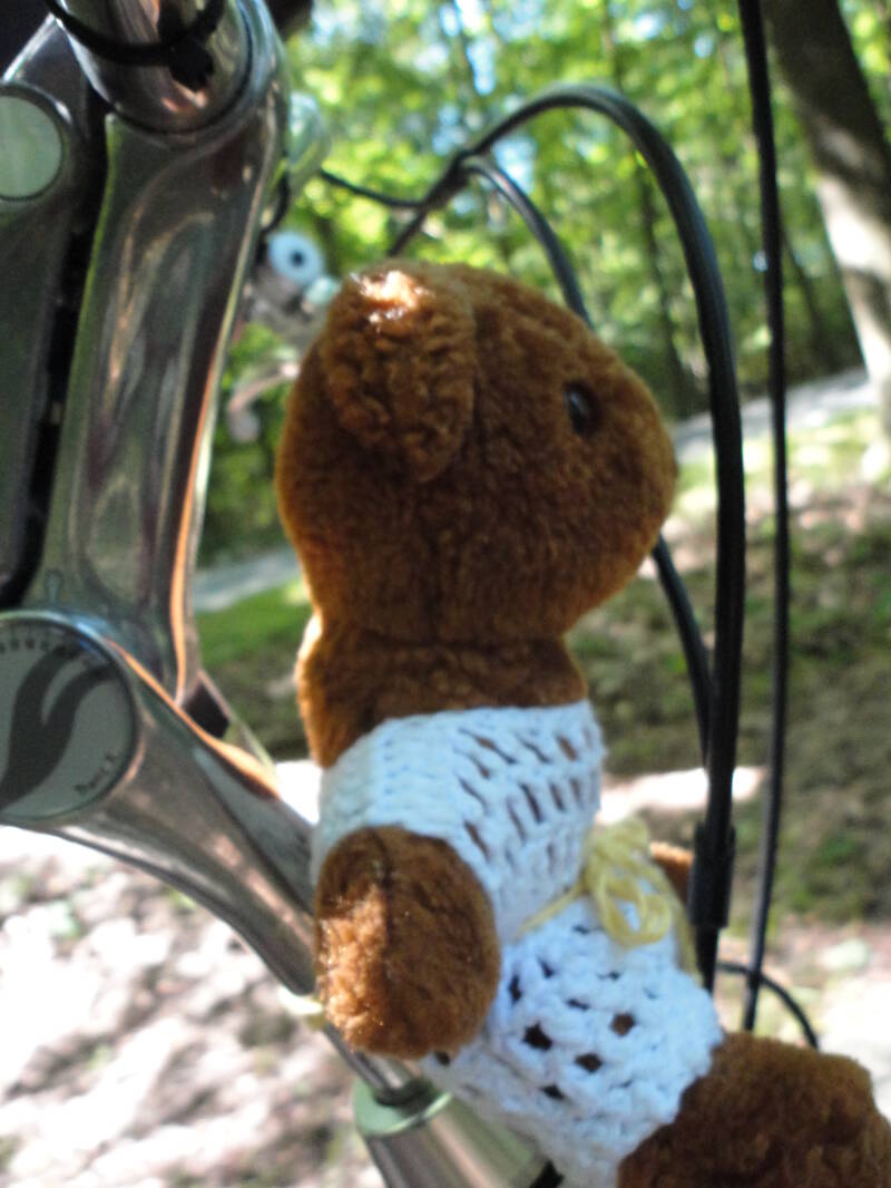 Mijn fiets doet een beetje vreemd, d.w.z wanneer ik de ondersteuning aandoe dan doet die niets. Nu kan het natuurlijk zijn dat de accu leeg is maar dat geeft die dus niet aan. Er zit nog één streepje stroom in, dat is nog altijd goed voor zo’n 15 km. Toch maar even kijken. Een rustig plekje opgezocht onder de bomen, de sporttas van de fiets gehaald en de accu verwisseld. Gelijk het regenpak maar even gedumpt in de dichtstbijzijnde afvalbak. Want die is ook niet waterdicht meer. Het was ook een goedkope bij de Action vandaan. (zie vakantie 2011).
