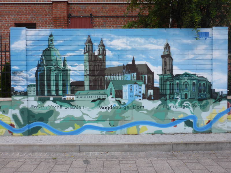 In Magdeburg aangekomen is het een feest van herkenning en ik weet ook zomaar ineens de Zur Hubbrücke is. Dat is namelijk de brug in Magdeburg waar oost en west Duitsland van elkaar gescheiden waren. Midden op de brug.