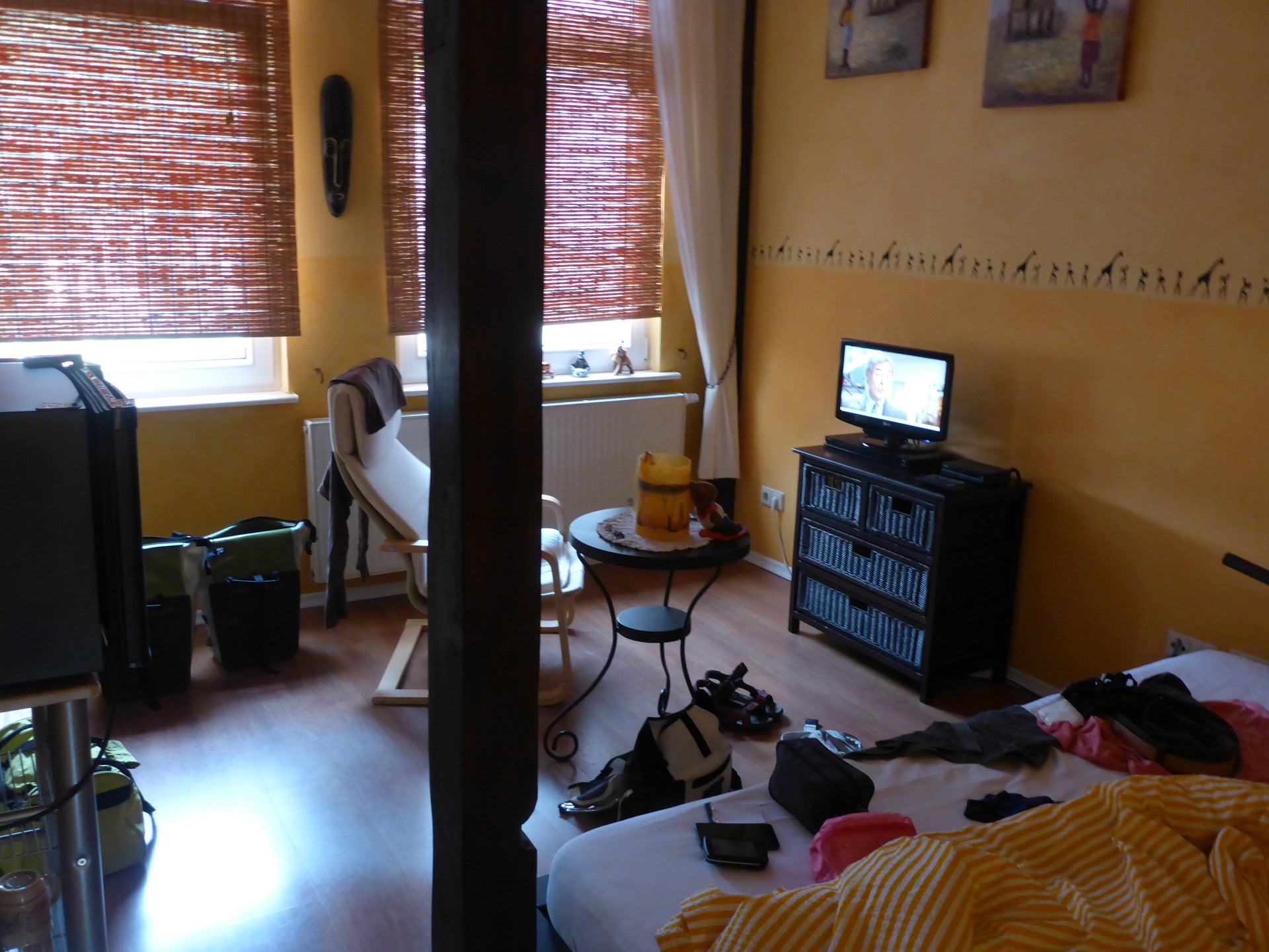 Na betaald te hebben ga ik weer terug naar het huis om vervolgens de fiets goed afgesloten in de kelder te zetten en de tassen naar boven te brengen. Er is een lift in het huis. De kamer is mooi en schoon. Kan ook niet anders want je mag er geen schoenen aan hebben in huis.