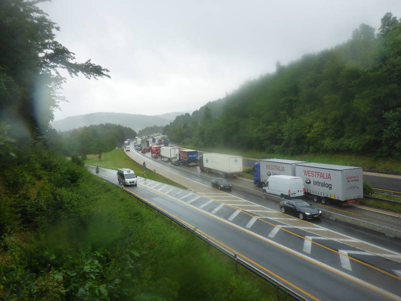 Vandaag voor het eerst het grootste gedeelte via fietsroutes gereden. Die vermijden in de meeste gevallen de grote voorrangswegen want die zijn erg druk. Op grote snelwegen mag je sowieso niet komen maar de wegen met bijvoorbeeld de nrs.62,59 of 88 zijn toch wel wegen waar je liever niet komt in de spitsuren. Maar soms moet je wel. Maar vandaag was het helemaal te gek. Rijd ik lekker kleddernat te worden op een fietsroute langs de Sieg, word ik ineens het bos ingestuurd om er bijna een uur later weer compleet bemodderd uit te komen..