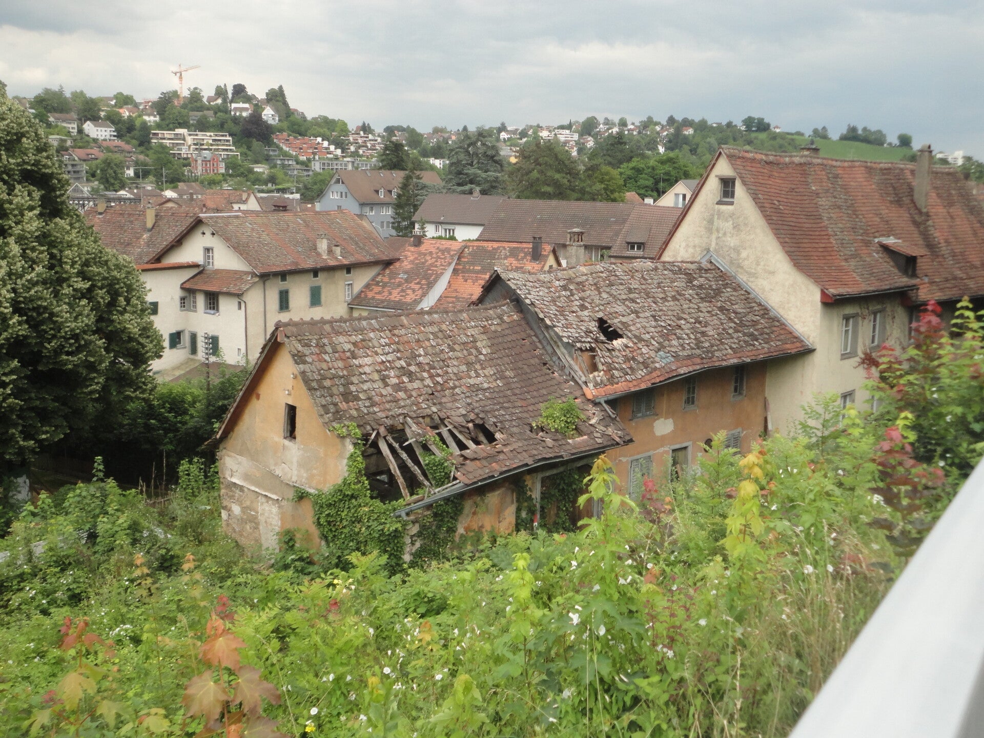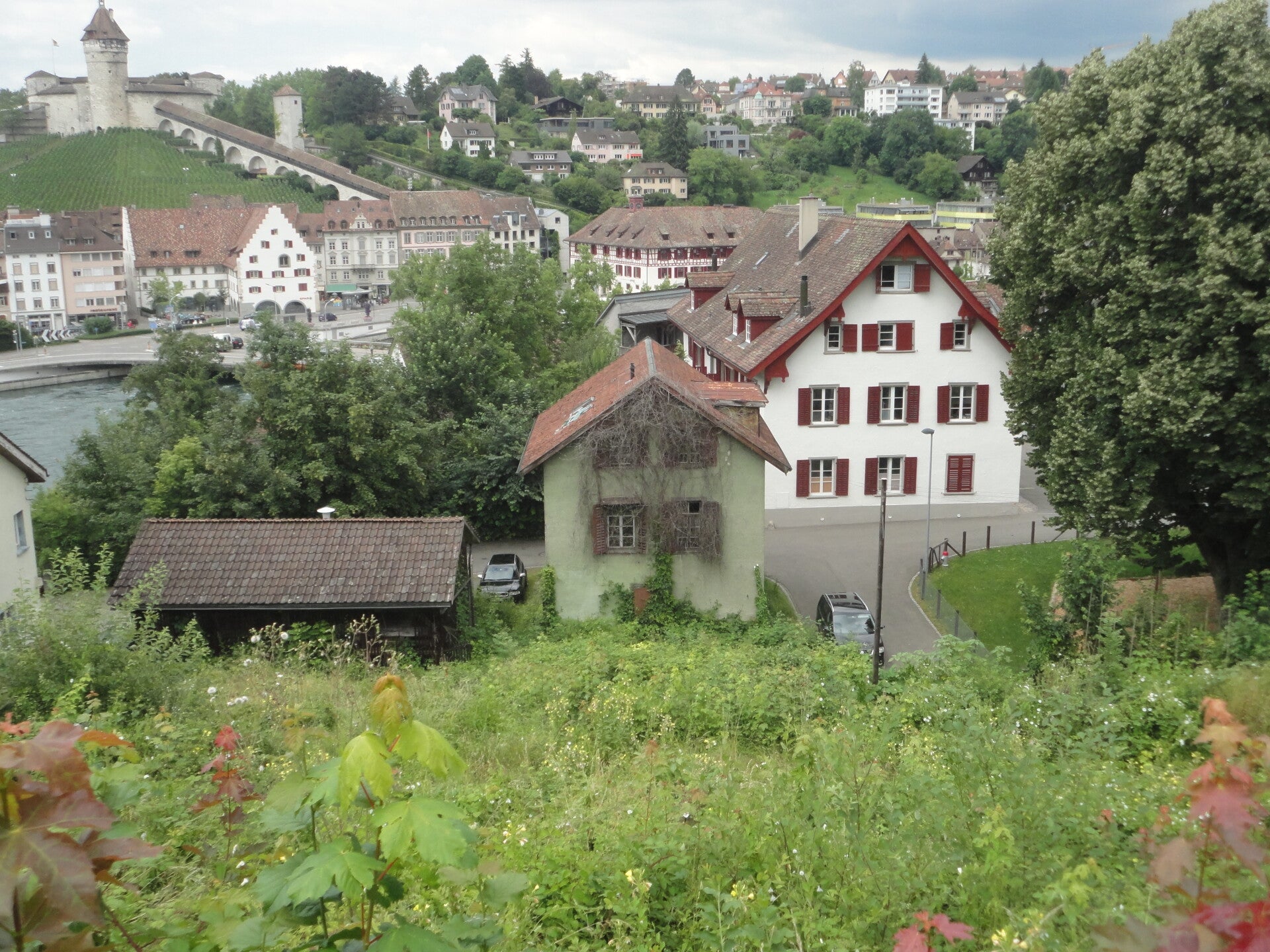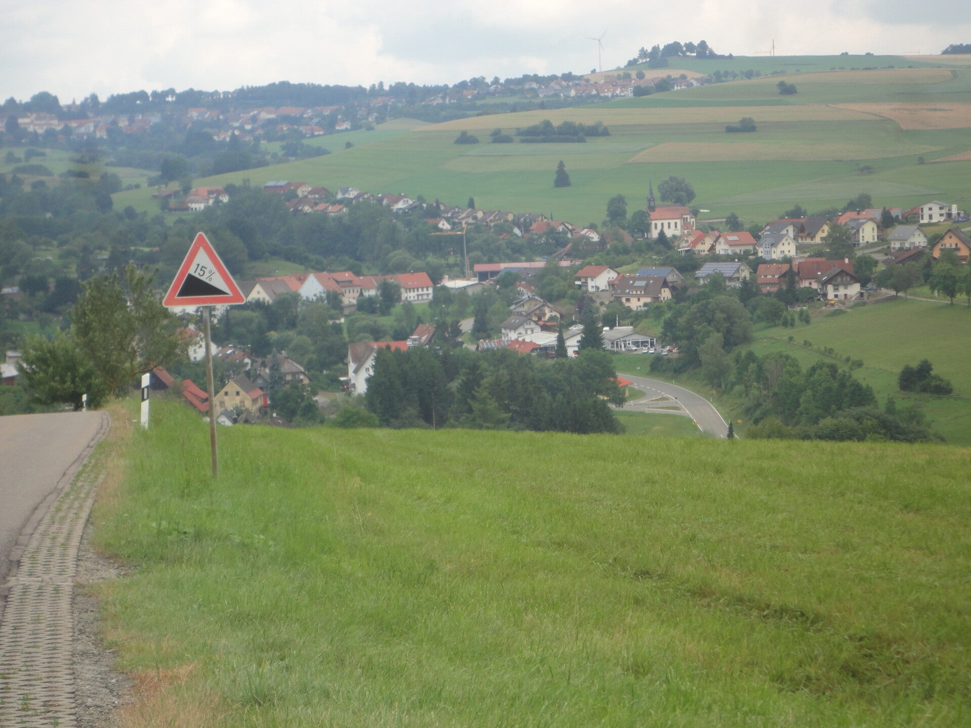 Nu ben ik gisteren het hele dorp doorgefietst om bij het hotel te komen en dat alles dankzij Garmin. En eigenlijk ben ik niet van plan om het hele dorp weer door te fietsen om er weer uit te komen. Gelukkig hoeft dat ook niet want vlakbij het hotel is het Rathaus en tegenover het Rathaus is de Tourist Information, daar kunnen ze me vast wel vertellen hoe ik dit dorp uitkom en de weg naar Schaffhausen vind. Maar de Tourist Information is nog niet open. Komt er een man op een fiets aan,blijkbaar ook met vakantie. Of ik hulp nodig ben, niet speciaal zeg ik maar ik wilde eigenlijk weten hoe ik in Schaffhausen kan komen zonder alsmaar over de B317 of B315 te moeten. Och zegt die mag wel met mij meerijden ik ga ook die kant op. Is niet nodig zeg ik, ik fiets liever alleen. Is ook goed zegt die, dan vertel ik zo wel even waar U langs kunt gaan. Hij pakt een kaart en wijst waar ik langs kan gaan. Ook wijst die nog even aan waar hij langs gaat want hij moet nog even een schloss op de foto zetten. Echt niet mee? Nee, dankjewel zeg ik. Ik fiets echt liever alleen. Ach, zegt die, ik kan het mij wel voorstellen ik fiets ook liever alleen. Nadat we elkaar een hand hebben gegeven gaan we elk onze eigen weg. Hij naar zijn Schloss en ik richting Stühlingen. Best een bar tochtje, want op een gegeven krijg ik een bergje van 15% omhoog. Dus dat is weer lopen. Ook als het naar beneden was geweest was het lopen geblazen geweest. De tocht gaat onder anderen door een groot donker bos, door wijnvelden en ook over de B nog wat.