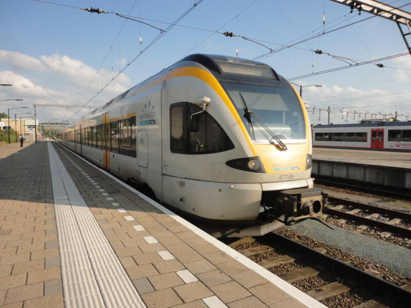 Tegen zes uur ben ik in Venlo, daar eerst maar eens iets gegeten en gedronken. Daarna eens even gekeken van welk perron de trein vertrekt en vooral wat voor trein het is, daar bedoel ik mee een hoge Duitse trein waar je alleen als vrouw zijnde met goed fatsoen geen fiets in krijgt of een regionale trein die net als de Arriva- en Veoliatreinen lekker vlak zijn en je zo in kan rijden.