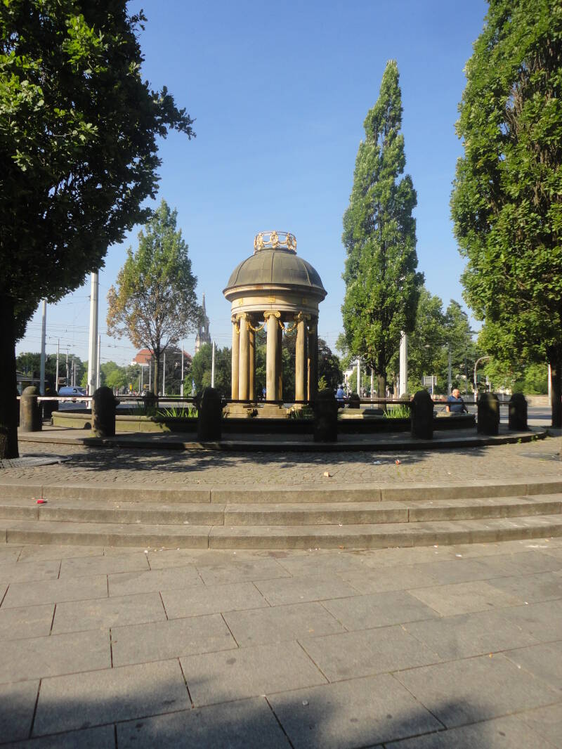 Ben ik net even buiten de Alt Stad hier me daar toch iets moois, zomaar een water iets, je kunt daar je fles vullen met water en je kunt gewoon je mond boven een straal water houden en net zoveel drinken als je wilt. Dat dan maar eerst even doen. En wat nog leuker is, dat plekje staat in de schaduw en er is bijna geen mens. Er staan een paar bankjes en een meneer van de VVV staat er met een karretje om de sightseeing aan te prijzen, alleen er komt geen mens naar haar toe. Ik dus ook niet.