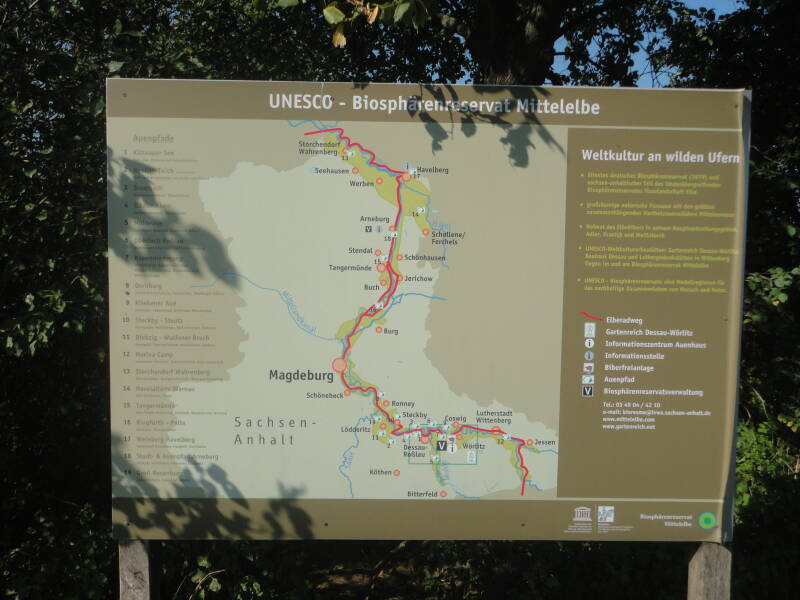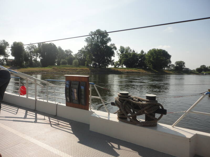 Ieder die dit leest vraagt zich waarschijnlijk nu af kom je vandaag niet in grote steden. Jawel Dessau is best wel groot en ik heb nog even overwogen om de stad in te gaan maar het is zondag en ook in Dessau is waarschijnlijk om 11.00 uur nog niet zoveel te beleven. Dus rijd ik maar door in de hoop dat er in mijn eindplaats Aken a/d Elbe wel iets te beleven valt. Maar dat valt vies tegen Aken a/d Elbe is een groot dorp met één winkelstraat, een paar kerken, geen kroegen en een paar restaurants die of gesloten zijn of pas om 17.00 uur open gaan. Nou, dat heb ik dan weer. Ergens had ik een benzinestation gezien, dan daar maar even heen rijden en iets kopen voor vanavond. Op mijn weg naar het benzinestation sta ik plotseling bij de veerpont die ik morgen moet hebben en bij de veerpont is een groot restaurant, dat komt goed uit. Ik ga even vragen tot hoe laat ze open zijn vanavond. Tot negen uur mevrouw, zegt het meisje achter de bar. Fijn, tot straks denk ik. Het wordt tijd dat ik Garmin mijn pension even laat opzoeken. Omdat er geen snelwegen in de buurt zijn heeft hij zo het adres van het pension gevonden. Ik bel aan en een aardige mevrouw doet open. Ik zeg wie ik ben en dat ik een kamer heb gereserveerd. Oh, haal uw bagage maar van de fiets, bent U de fiets nog nodig, ja ik ben de fiets nog nodig tenzij U iets weet op een afstand niet verder dan een kilometer. Nee, zegt ze alles is verder weg. Nou zeg ik dan ben ik mijn fiets nog nodig vandaag. Waar komt die te staan wanneer ik terug kom van het eten? Achter in de tuin en u moet dan even door het huis. Ik kijk zo de gang door. Allemaal kleine trapjes van zo’n drie treden. Dat is leuk morgenvroeg.