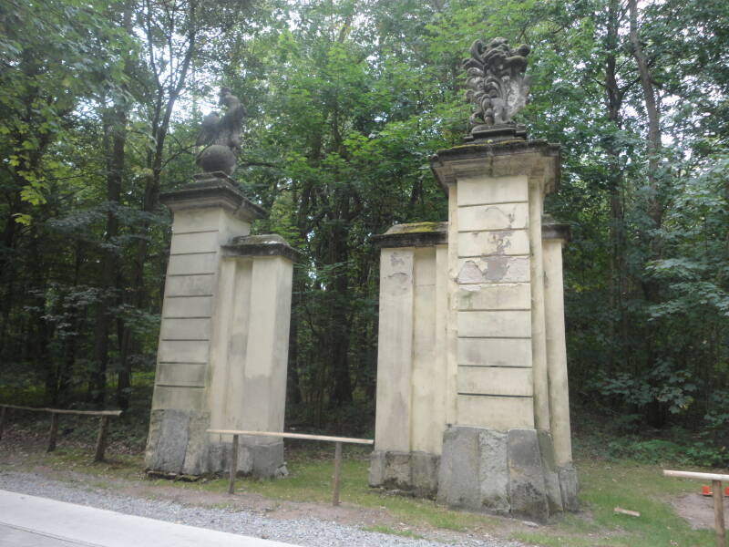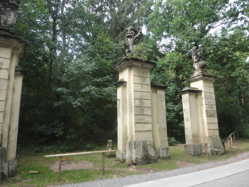 Een tiental kilometers verder ergens in een bos even weer een drinkpauze en wat foto’s van de muren van een poort van een nog ouder landgoed.