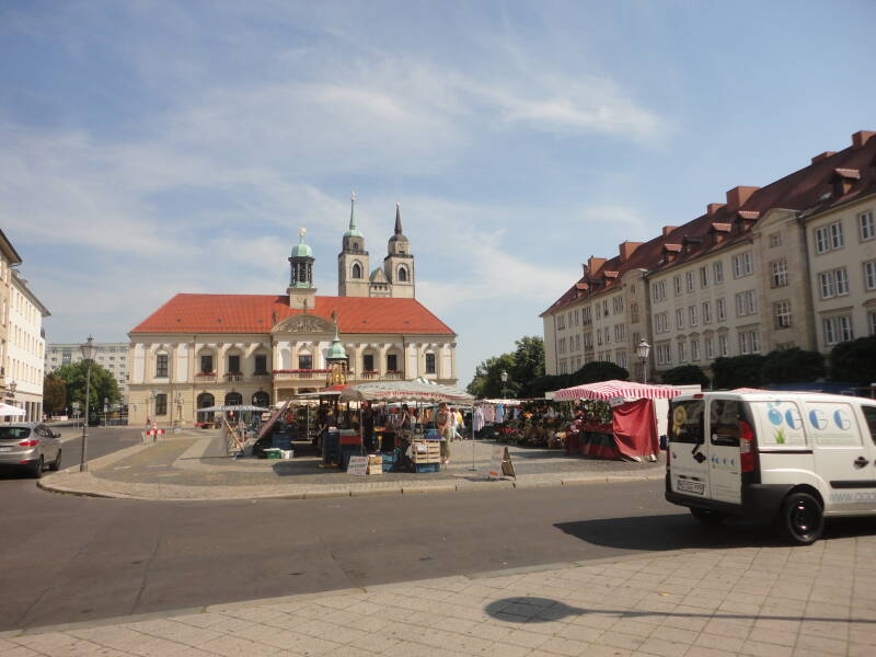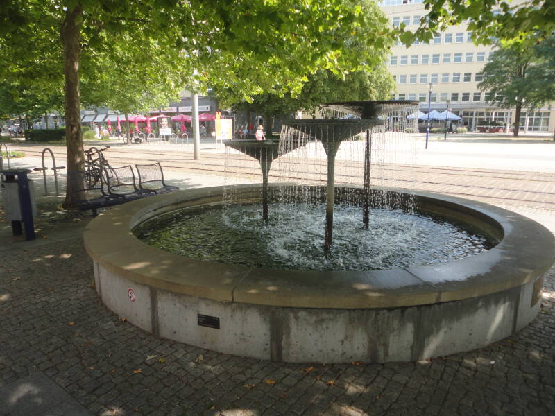 Nu eerst maar eens echt naar de Altstadt. Naar de Alter markt. Daar zet ik onder de bomen in de schaduw mijn fiets neer. Vlakbij een restaurant en goed op slot.