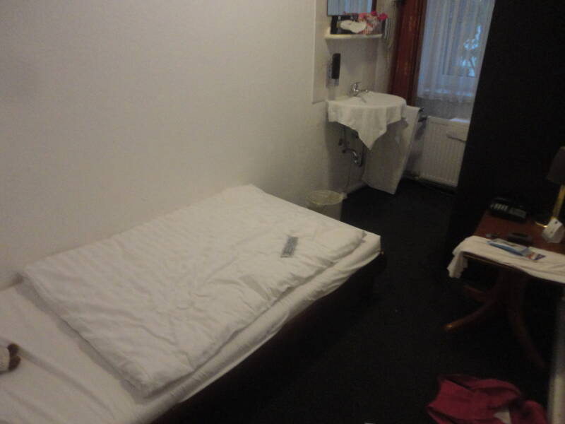 Ik ga naar beneden naar de bergruimte en kom tot de ontdekking dat de band weer zacht is. Ik wordt hier eigenlijk niet goed van dat gezeik al met die achterband. Moet ik eerst weer naar die fietsenmaker in de regen en dan mijn fiets weer ergens neerzetten omdat die niet in dat bagagehok mag staan. En geen van de receptionisten kan mij vertellen waarom het niet mag.
