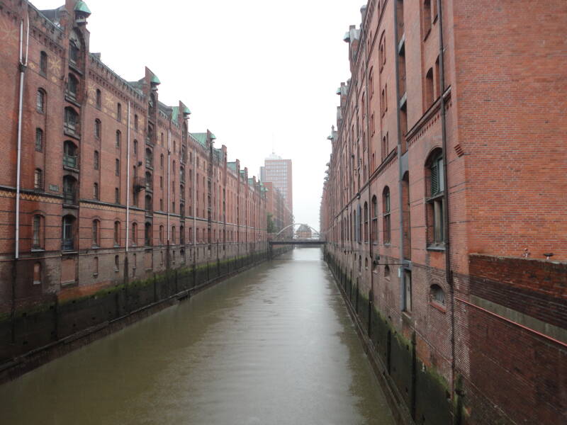 Na het eerste rondje stad maar eerst even uitstappen, het regent nog steeds. Bij het Rathaus waar ik nu weer ben ga ik maar eens naar binnen en wat foto’s maken. Weer buiten gekomen blijf ik ergens achter haken en mijn poncho is stuk. Aan de andere kant van het plein staan een aantal kiosken in één daarvan verkopen ze ook paraplu’s. Daar maar even heen en eentje kopen. Dan even een eindje lopen en wat foto’s maken dan weer een eindje bussen, wanneer het wat minder gaat regenen stap ik uit en loop door het havengebied en de Speigerstadt.