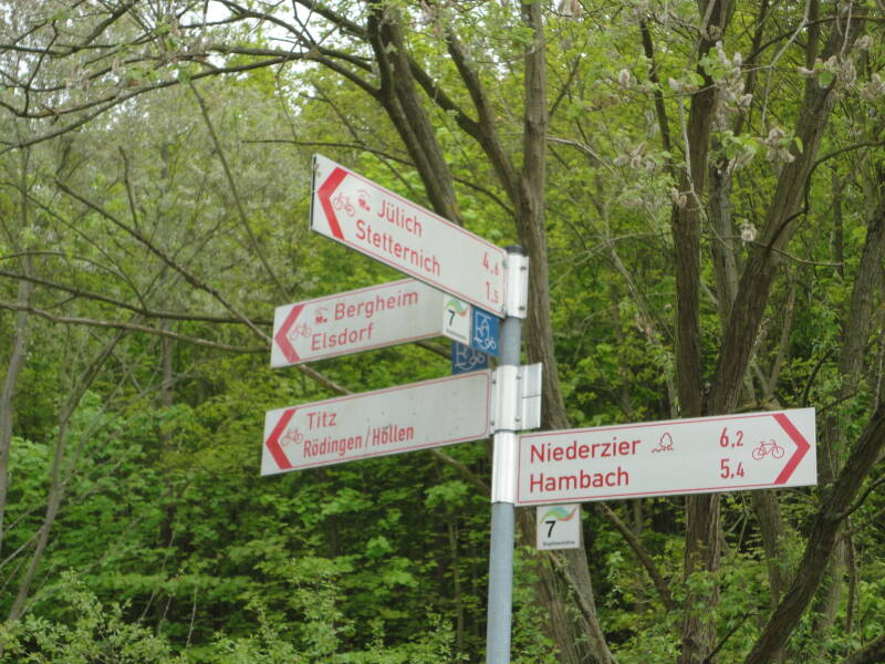 Nu had ik thuis de route van Roermond naar Elsdorf uitgeprint maar die routebeschrijving geeft niet aan dat er rondom het station van Roermond heftig aan de wegen wordt gewerkt. Dus maar eens even op de navigatie een straat ingetypt waar ik heen wil, maar ook dat is niet echt een succes. Dan maar op goed geluk ergens heen fietsen, ik zit tenslotte tegen de grens van Duitsland aan. Uiteindelijk toch maar even aan iemand gevraagd waar of ik langs moet wanneer ik naar Heinsberg wil. Nou, ik zit dus op de goede weg en ik kan alsmaar rechtdoor fietsen. Dat gaat dus lekker. Maar wat wanneer de weg rechtdoor eindigt en je alleen maar links of rechts kan?