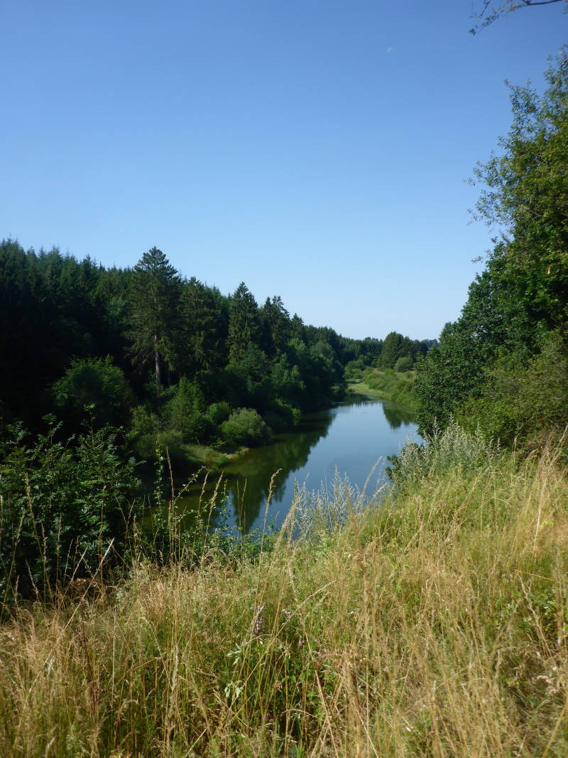 Aan de mevrouw van de Toerist heeft het niet gelegen, aan het kaart die ik van haar gekregen heb ook niet, aan de navigatie ook niet en ook niet aan mij want met deze hitte ben ik extra alert op dit soort dingen. Ik ga er nog steeds vanuit dat er weer ergens een bordje van de Roer-Radweg verstopt was of er gewoon niet of nooit is geweest. Tot Kaltherberg gaat alles goed, daar is zelfs nog een bordje maar daarna houd alles op en besluit ik om tot Monschau te fietsen via de Vennbahn-Radweg want ik weet dat ik daar op de parkeerplaats een bordje heb gezien met Roer-Radweg. Wat er tussen Kalherberg en de parkeerplaats fout is gegaan geen idee maar ik kom verkeerd uit en besluit om dan maar naar de volgende bekende plaat te gaan en tevens de gemeente waarin ik denk dat Woffelsbach ligt en dat is Simmerath. Misschien dat ik dat beter niet had kunnen doen want vanaf dat moment krijg ik eigenlijk alleen maar bergen, oké er zijn natuurlijk ook afdalingen maar dat gaat dan weer steil naar beneden. Er was er zelfs een bij die zo steil naar beneden ging dat ik maar een eindje ben gaan lopen.