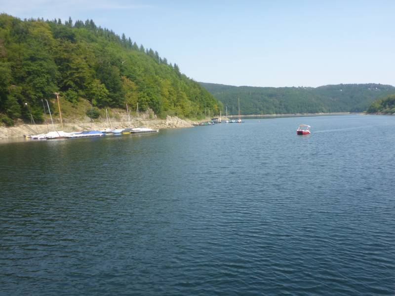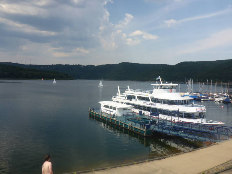 Na een nachtje slapen denk ik eruit te zijn betreffende de reis naar Düren maar wanneer ik de weg wil gaan die ik dan moet gaan zakt de moed mij in de schoenen. De heuvel die ik afgelopen woensdag nog naar beneden ging (lopende) moet ik nu weer omhoog. En gelijk denk ik nee, van mijn lang zal ze leven niet. Ik weet hoelang dat stuk is dat staat mij nog helder voor ogen. Dus dat gaat niet door. Dan maar weer naar beneden heel erg voorzichtig. Op een en of andere manier moet ik toch zonder al te veel kleerscheuren in Düren terecht komen. Aangezien er wel een manier is maar ik niet weet wat mij onderweg te wachten staat besluit ik om vandaag maar eens een rondvaart te maken. De boot die ik hebben moet vertrekt vanaf Woffelsbach en gaat naar Schwammenauel. Ik koop een retourtje want ik wil ook weer terug, het is namelijk een eind zwemmen of lopen. In Schwammenauel staat een treintje dat een rondrit maakt en daarbij door Heimbach komt. Het lijkt mij wel een goed idee en even denk ik nog ik neem de fiets mee op de boot maar wanneer ik zie hoe er eigenlijk wordt omgegaan met mensen die in een rolstoel zitten denk ik van, nou nee toch maar niet.