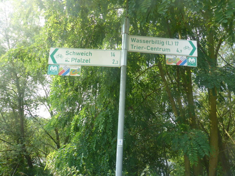 Langs de weg loopt het spoor en dat weer naast een fietspad en om dat fietspad gaat het, ik wil en moet op dat fietspad fietsen, ik zie daar ook allemaal mensen fietsen, maar hoe komen die daar. Eigenlijk vraag ik mij dat al af vanaf het begin dat ik hier ben. Om er nu achter te komen moet ik dus langs die drukke weg lopen naar het eerstvolgende dorp, of liever gezegd het eerstvolgende stadsdeel van Triër, genaamd Biewer. Tja en dat ligt nu eenmaal 4 km verder. In dat dorp is een straatje en juist dat straatje moet ik hebben want dat straatje gaat naar de Moezel en aangezien de Kyll (waar ik vanaf morgen langs ga ik de Moezel komt ) is de Moezel op dit moment samen met mijn leven belangrijk.